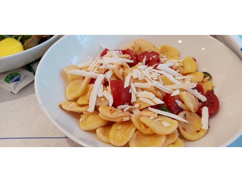 Il menù offre una varietà di piatti, tra cui insalate fresche e creative, orecchiette con ingredienti di stagione e un delizioso misto di farro con uova sode e avocado. Ho assaggiato un'insalata con valeriana, mango e salmone, davvero deliziosa, e le orecchiette con peperoncino, pomodorini e ricotta salata e basilico, un piatto semplice ma gustoso.
