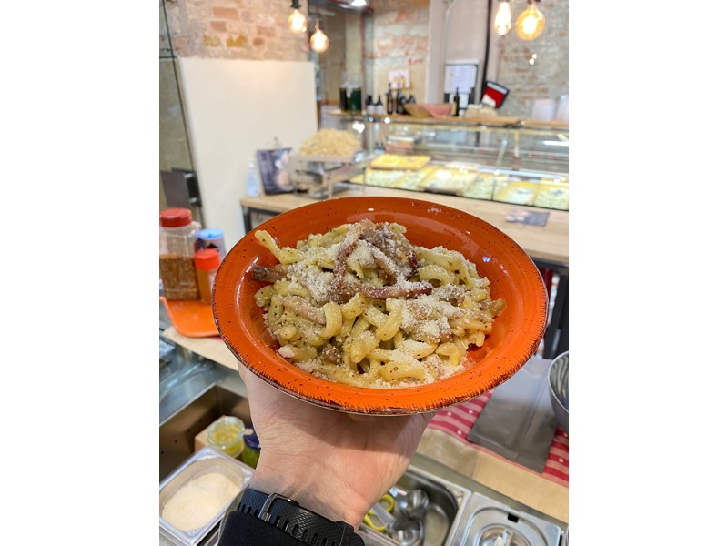 Ottima carbonara, assaggiata velocemente durante una passeggiata in centro. Il resto della famiglia cacio e pepe e pesto. Ottima qualità e prezzi contenuti.